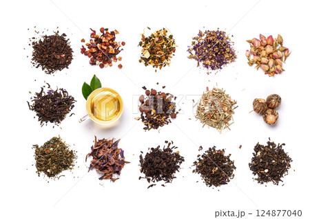 An assortment of various dry tea leaves, showcasing different textures, colors, and blends