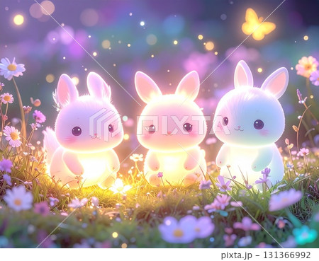 光るうさぎが花咲く草原に集うメルヘンで幻想的なファンタジーイラスト