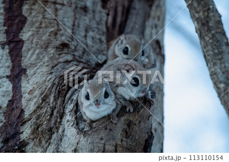 巣穴から顔を出した二匹のエゾモモンガと樹皮を食べる二匹のエゾモモンガ