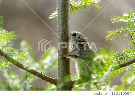 夕刻の光を浴びながら樹木にとまり下を見るエゾモモンガ