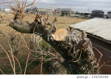 太い枝を剪定した後の桜の木