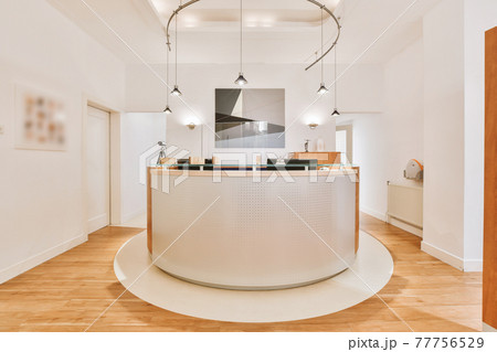 Spacious empty office with gray floor and tables with chairs awaiting relocation call center of taxi services. The concept of creating new jobs in the city and a modern and comfortable workplace