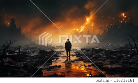 A man stands on the ruins during a fire after the fighting in the war, the view from the back