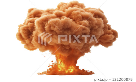 Bright explosion with fiery flames and thick smoke against a white background