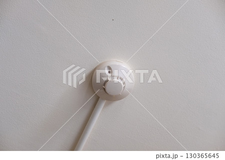 Cassette type air conditioner and smoke detector mounted on ceiling wall. Air duct on ceiling in hotel. Air heading unit on gypsum wall. Cool system in the building. Air flow and ventilation system.