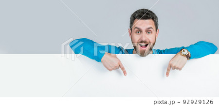 Man face portrait, banner with copy space. point finger on copy space. place for promotion and creativity. your marketing design.