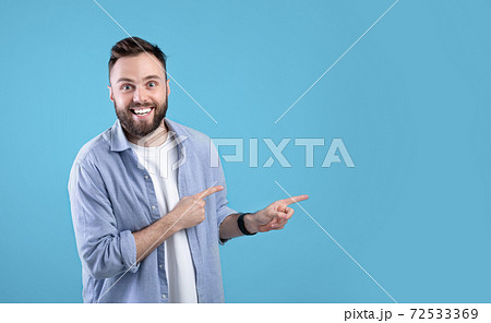 Excited young bearded guy smiling and pointing aside at empty space over blue studio background, panorama