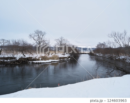 冬の北海道釧路市標茶町クチョロ原野塘路線のスガワラカヌー発着場周辺