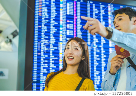 空港で情報確認するカップル ■撮影協力:関西国際空港(KIX)