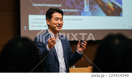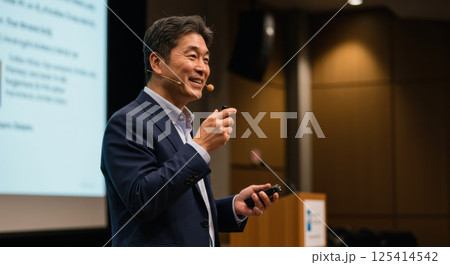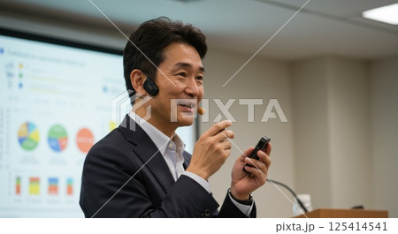 スピーチデバイスで講義する日本人男性(ai生成画像)