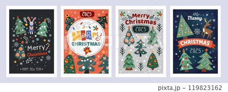 New Year card pattern. Background with Merry Christmas tree. Winter doodles. Happy abstract ornament. Cute snowy forest postcard. Poster and banner collection. Vector tidy cartoon festive illustration