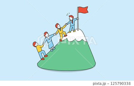 Business professionals ascend a mountain staircase toward a red flag, symbolizing career success and goal achievement. The image conveys teamwork, ambition, and perseverance in a corporate setting