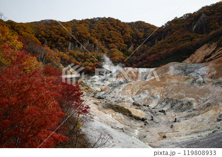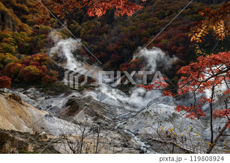 紅葉に包まれた奥の湯のパノラマ情景@登別、北海道