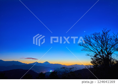 東京都八王子市の高尾山頂(大見晴園地)から西側の夜景(富士山,山並み,金星など)