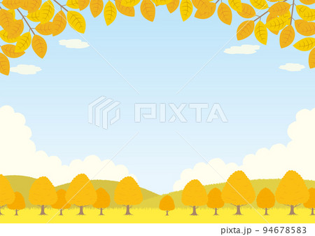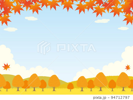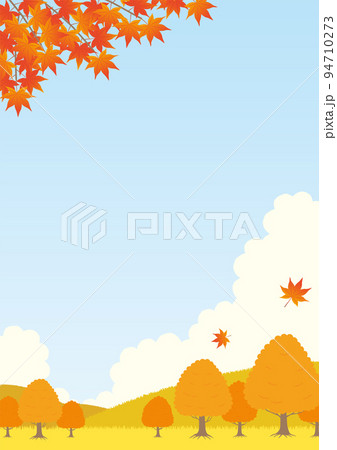 紅葉した草木と秋空の広がる風景 自然あふれる水彩背景イラスト