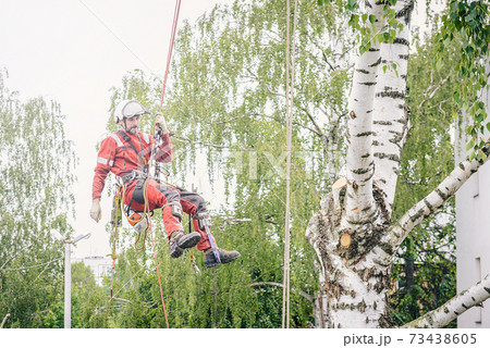 Woodcutter in uniform climbing and working on heights, process of tree trunk pruning and sawing.