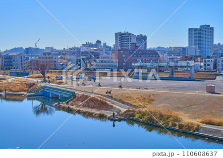 神奈川県川崎市多摩区登戸の稲田多摩川公園方面の眺望(五反田川放水路など)