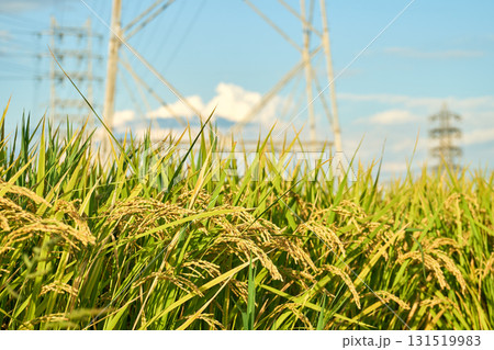 黄金色に輝く稲穂と鉄塔と入道雲。収穫時期を迎えた田んぼの風景。背景にピント