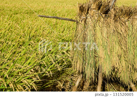 稲架に掛けて天日干しされている稲とこれから収穫される稲。収穫時期を迎えた田んぼの風景