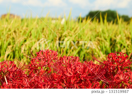 黄金色の稲穂を彩る真っ赤な彼岸花。秋らしいのどかな日本の田園風景