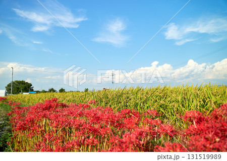 黄金色の稲穂を彩る真っ赤な彼岸花と白くて大きな入道雲。秋らしいのどかな日本の田園風景