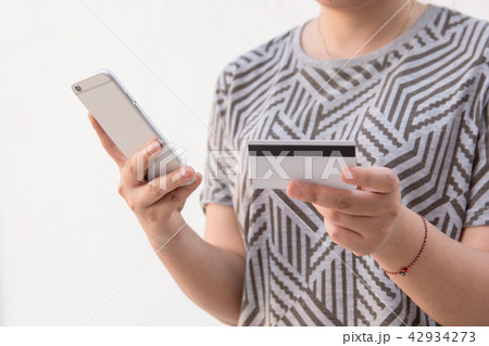 Woman holding credit card and using smart phone