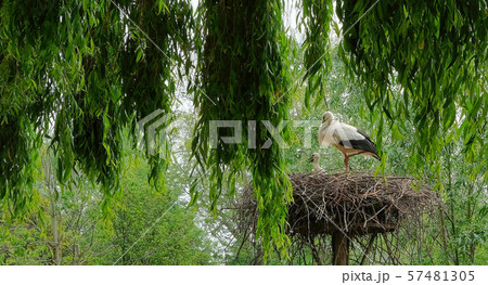 Heron with Young in nest in a forest