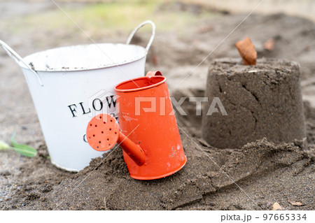 ガーデニングのバケツとジョウロを使って砂場遊び