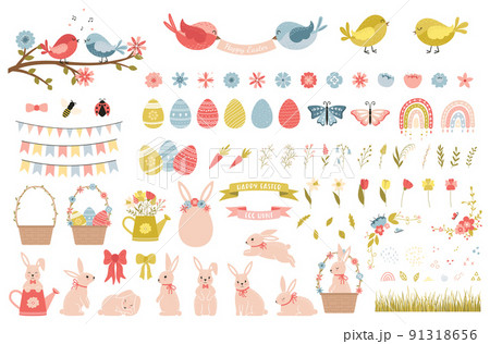 A set of cute decorative elements for Easter and spring. Flowers, birds, eggs, Easter bunnies, rainbows. Collection of cartoon decorative elements. Vector illustration isolated on a white background.