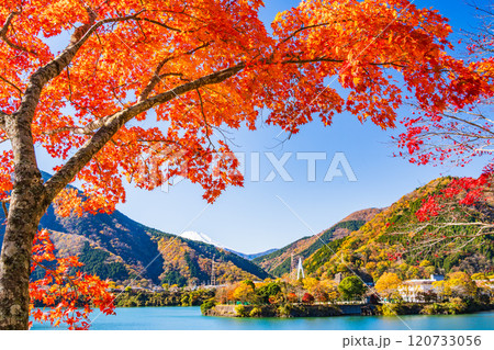 【神奈川県】丹沢湖・湖畔の燃える紅葉 後方に富士山