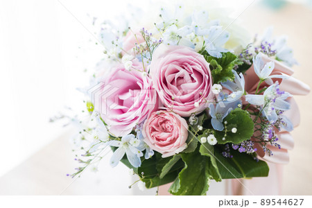 Women's workspace with pink and beige roses flowers bouquet, accessories, diary, glasses on white background. Flat lay, top view. Beauty blog concept.