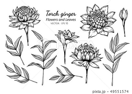 set of torch ginger flower and leaves drawing
