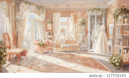 Watercolor illustration of a cozy bridal salon interior filled with elegant dresses and romantic decor elements for wedding inspiration and fashion design concepts