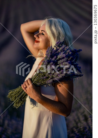 Blonde woman poses in lavender field at sunset. Happy woman in white dress holds lavender bouquet. Aromatherapy concept, lavender oil, photo session in lavender