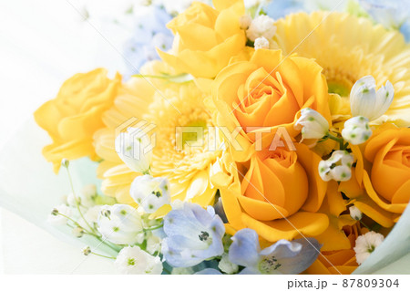 黄色いバラとガーベラのブーケ 花束の写真素材