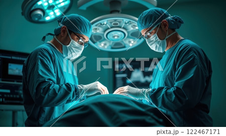 Woman scientist wearing lab coat and protective glasses is using microscope in modern laboratory setup. Low key lighting photo. Science and Medicine