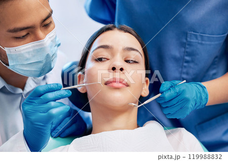 Dentist, woman patient and worry in clinic for inspection with metal tools, hygiene and healthcare consultation. Doubt, orthodontist and female person with scared for medical exam with equipment