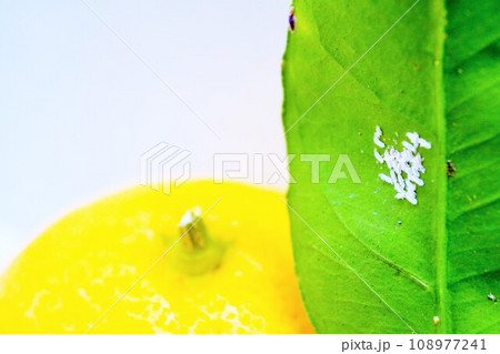 白背景に温州ミカンの葉の裏に集団で付いた白く小さい害虫、ヤノネカイガラムシ