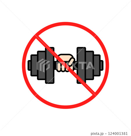 Dumbbell with hand and prohibition sign. Ban on lifting weights and exercising. Isolated vector illustration on white background.