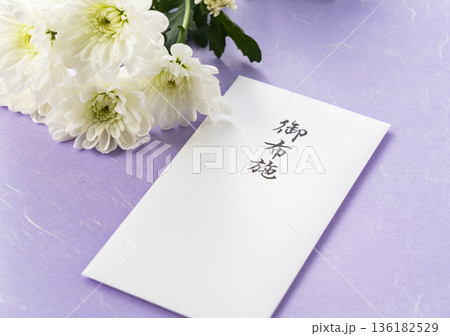 紫色の和紙を背景にした白い菊の花と「御布施」の封筒(仏事・葬儀イメージ)