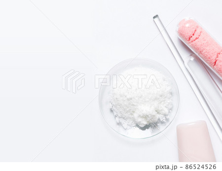 Beauty care cream, himalayan pink salt and Polyacrylic acid powder placed next to Stirring Rod and Test tube. Chemicals for beauty care on white laboratory table. (Top View)