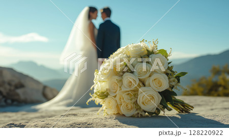 White rose bouquet in focus on rocky surface with bride and groom holding hands in the background against a mountain landscape. Romantic scene.