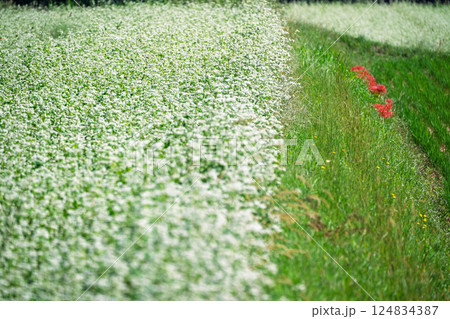 滋賀県高島市今津町日置地区で撮影した絨毯のように広がる蕎麦の花