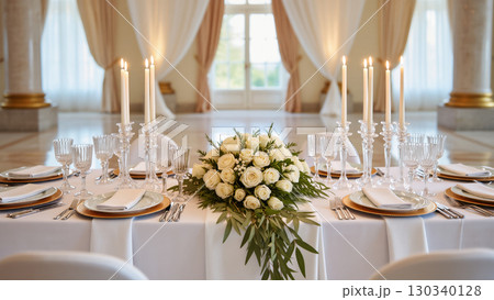 Luxury wedding table setting with white roses, candles, elegant tableware and crystal glasses in bright classical interior.