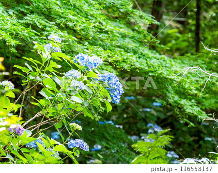 梅雨時期の景色 美しく咲き始めたカラフルなアジサイ