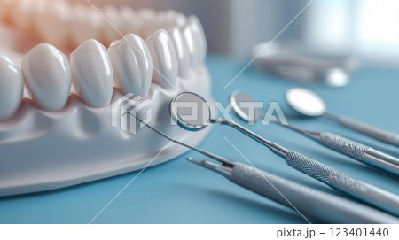Photorealistic Display of Modern Dental Tools Including Mirrors, Explorers, Scalers, and Syringes on Neutral Background, Emphasizing Cleanliness and Technological Advancements for Optimal Oral Health