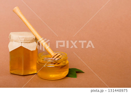 Honey in jar with leaves and honey dipper on colored background top view with copy text