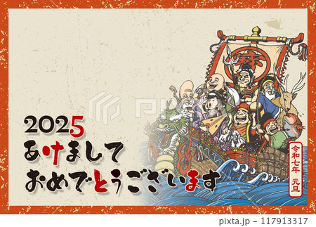 2025年賀状テンプレート「七福神と宝船」あけおめ 手書き用スペース付