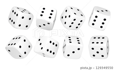 White dice set on isolated background. Random rolling dice cubes. White roll cubes for gamble games. 3d rendering