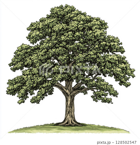 A vibrant, full-grown oak tree with dense green foliage and a sturdy brown trunk stands on a patch of grass against a clean white background.